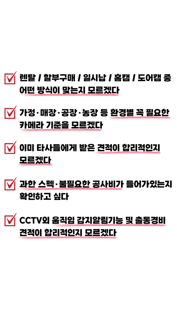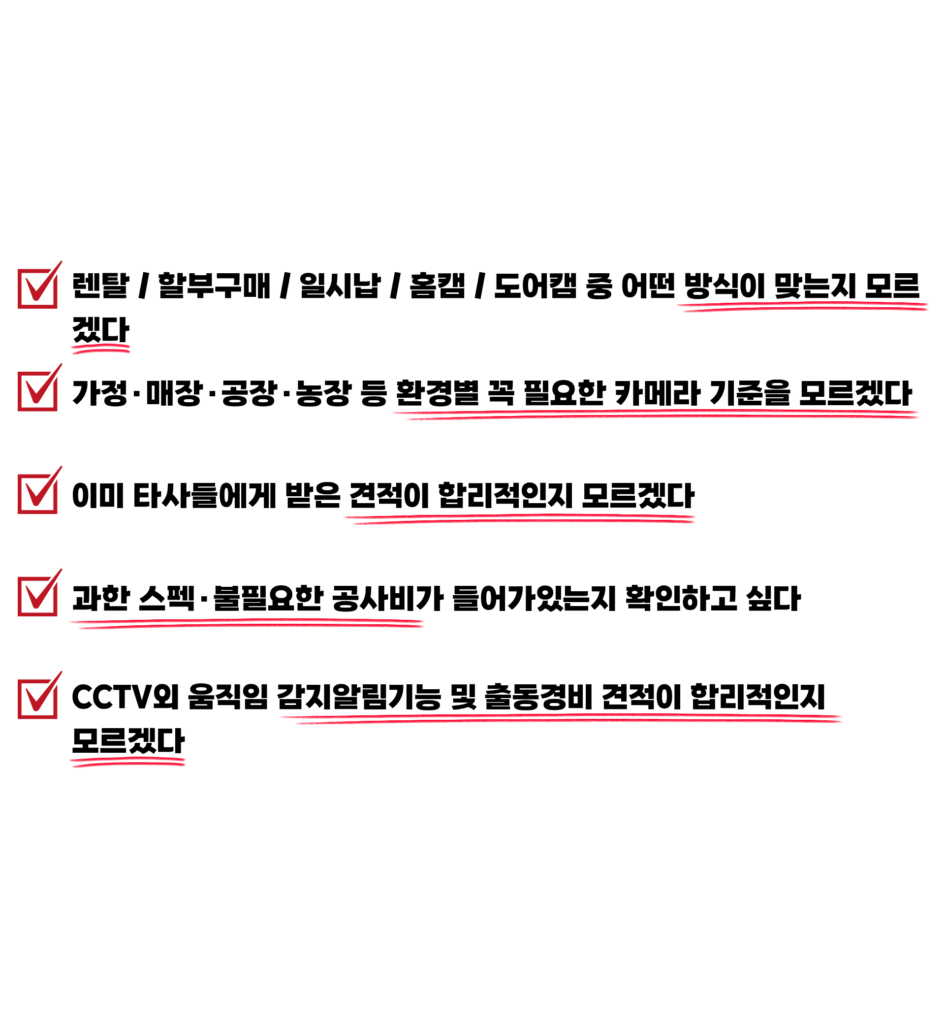 월 9천원대 이용가능한 CCTV 무료 상담권이 2개 남아 있습니다! CCTV설치, 모르고하면 최대 100만원 손해봅니다 ※CCTV설치공식이드는특정업체가 아닙니다 상황에 맞는 CCTV추천과 저렴하게 할 수 있는 방법을 알려드립니다. 0507-1315-8771 지금 바로 전화하기 이 양식을 작성하려면 브라우저에서 JavaScript를 활성화하십시오.이 양식을 작성하려면 브라우저에서 JavaScript를 활성화하십시오.연락처지역 개인정보처리방침 동의 카메라 장소희망 카메라 개수개인정보처리방침 동의동의동의 안함최저가견적 알아보기 저는 33살, CCTV설치기사 5년차입니다 그래서 더 많이 봤습니다 5년간 4,800곳 이상을 직접 설치하며 소비자가 어디서 손해 보는지 현장에서 배웠습니다. "팔기 위한 설명" 이 아닌 "손해 안 보는 기준" 을 제공합니다 문제는 가격이 아니라 소비자가 확인할 기준이 없다는 것입니다 대기업이든 개인업체든, 모르면 똑같이 당합니다 CCTV설치 피해는 일부 나쁜업체의 문제가 아닙니다.정보가 없는 소비자를 상대로 반복되는 정해진 패턴이 있습니다 실제 고객님 피해 사례 대기업, 개인업체 CCTV어플 실제 리뷰 CCTV를 처음 접하시는분들 이 견적이 맞는지, 설명이 진짜인지 판단하기 어렵습니다 설치하기전에 보셔서 너무 다행입니다 이런 고민 많으시죠? 이런분들 꼭 상담이 필요합니다 정직함에 감동한 소비자들의 솔직후기 무료전화상담 최저가견적확인